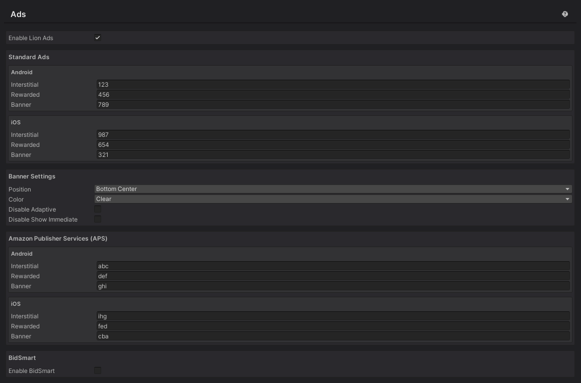In the Ads section, enter the required ad unit IDs for each supported platform. Your Lion Studios manager will provide these IDs during setup.