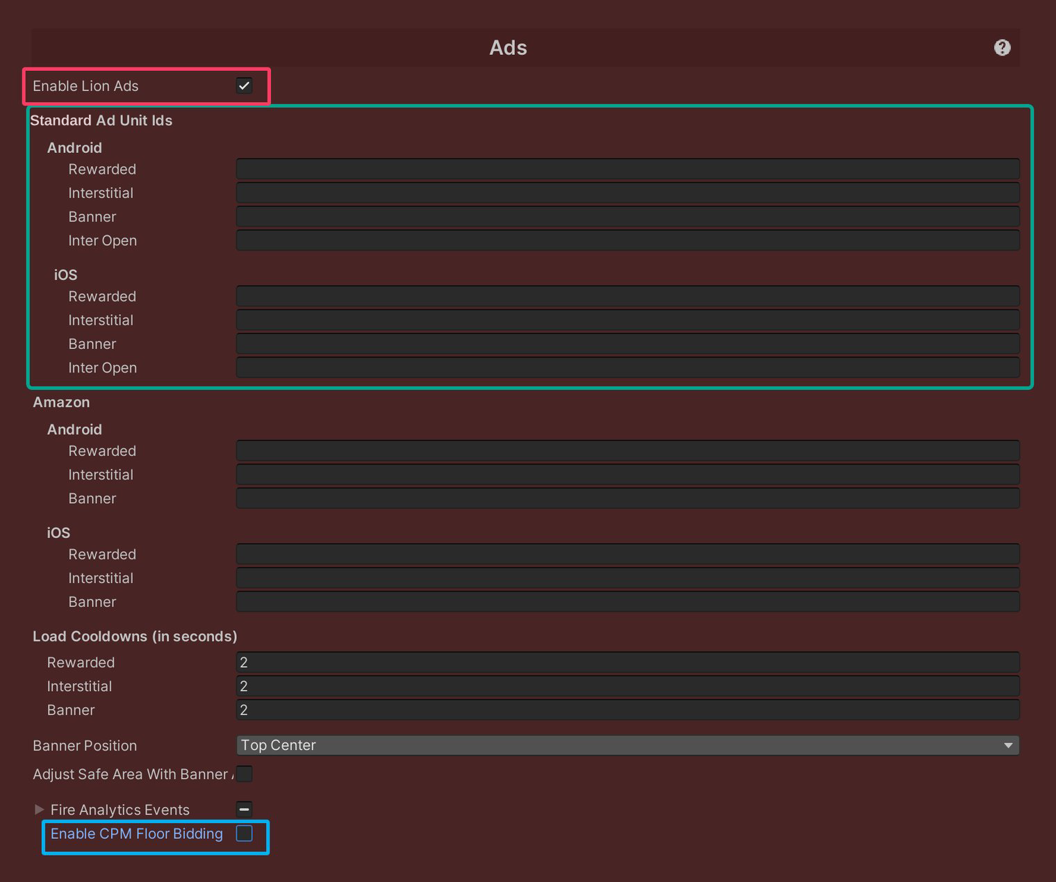 The Lion Ads default Ad Unit IDs should be populated with the standard ad unit IDs (see the green-marked area).