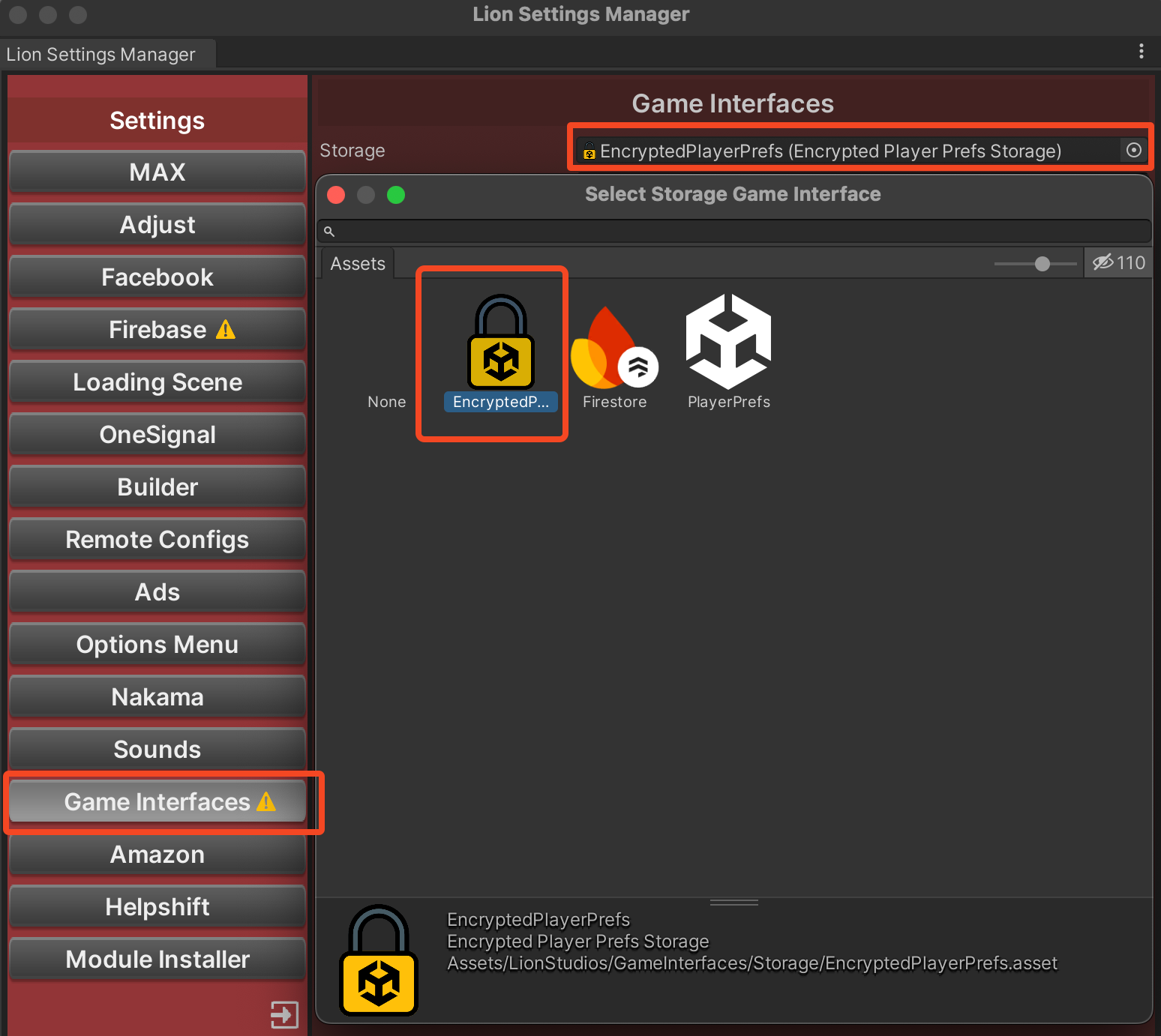 Use Settings Manager → Game Interfaces → Storage → Encrypted PlayerPrefs to select the storage type.