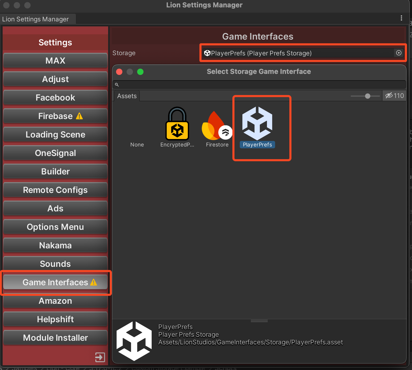 Use Settings Manager → Game Interfaces → Storage → PlayerPrefs to select the storage type.
